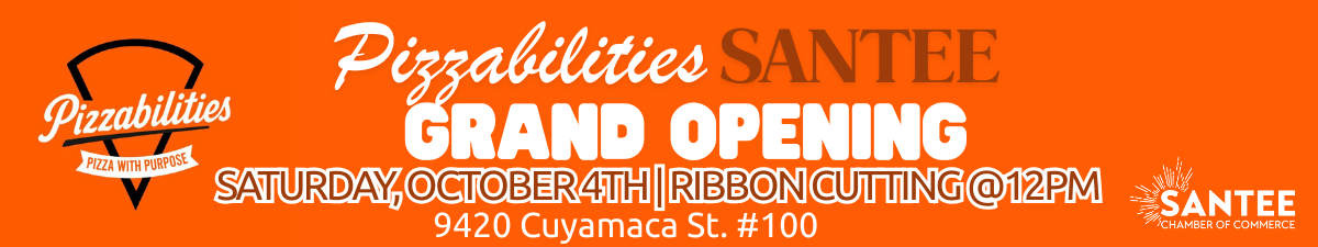We’re excited to welcome Pizzabilities to Santee! 🎉 Join us for their Grand Opening on Saturday, October 4th from 11:30am to 1:30pm. The ribbon cutting ceremony will begin promptly at 12pm. 📍 Pizzabilities - 9420 Cuyamaca St. #100 Let’s show our support and give them the warm Santee welcome they deserve—see you there!